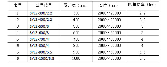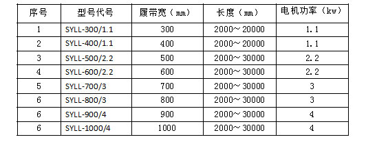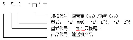 標記示例:SYLA-600/2.2型,表示履帶寬度為600mm的園棍履帶輸送機,直線型,電機功率2.2kw。